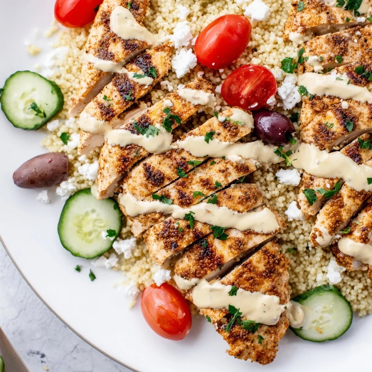 - Divide the couscous among four bowls and arrange the spinach or arugula on one side. Arrange the sliced chicken, tomatoes, cucumber, red onion, olives, and feta in sections on top of the couscous.