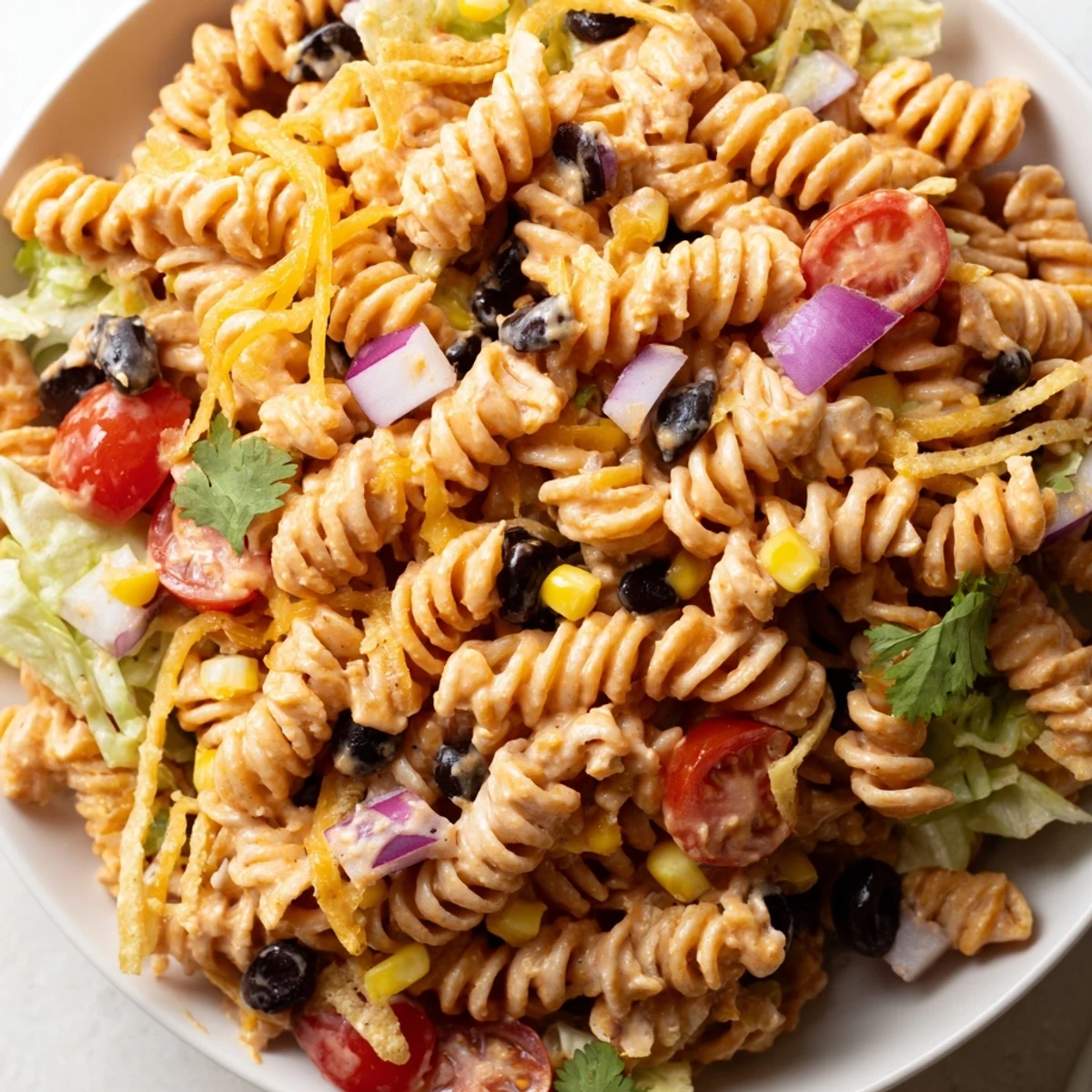 This vibrant dish combines spiral pasta with all the beloved elements of tacos—seasoned meat, black beans, corn, crisp vegetables, and cheddar cheese—all coated in a tangy lime and sour cream dressing. The crunch of tortilla chips added just before serving gives it that signature taco texture. Ready in 30 minutes, it's an ideal make-ahead option for gatherings or a hearty weeknight dinner that serves six.